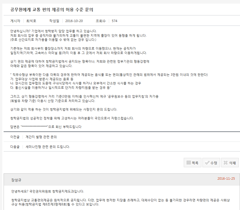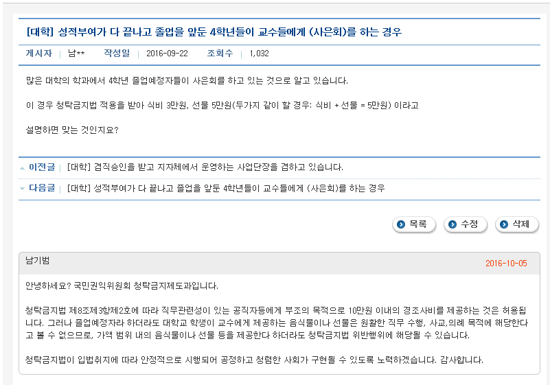 청탁금지법 > 청탁금지법 > FAQ게시판
