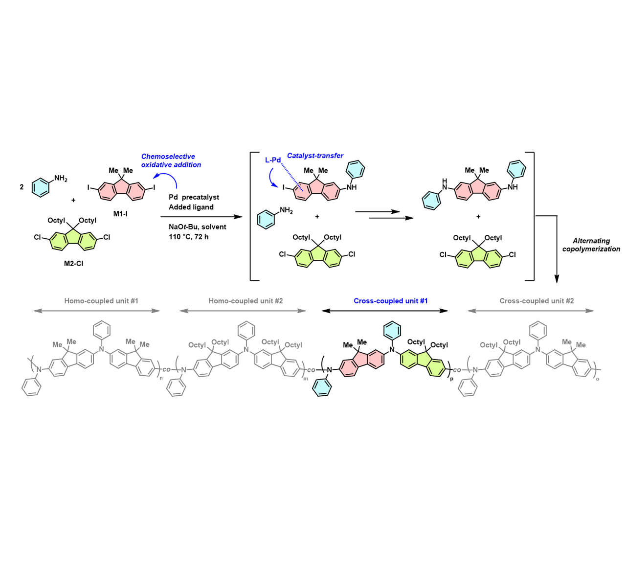 우리 학교 이인환 교수 연구팀이 반도체성 고분자 소재의 구조를 자유롭게 설계할 수 있는 새로운 합성법을 개발하는 데 성공했다. 이에 전자소자에 활용되는 고분자를 보다 신속하게 제작할 수 있게 되어, 차세대 유기 반도체 개발에 기여할 수 있을 전망이다.이인환 교수는 세 종류의 단량체를 한 번에 반응시키는 ‘다성분 중합법(Multicomponent Polymerization, MCP)’을 통해 반도체성 고분자 내부의 서열을 정밀하게 제어하고, 다양한 구조를 효율적으로 구현할 수 있는 기술을 개발했다고 밝혔다. 이번 연구는 '할라이드 쌍 기반 다중 성분 중합법을 통한 서열 제어 반도체성 덴드론 고분자의 라이브러리 합성(Versatile Halide-Pair-Driven Multicomponent Polymerization for Library Synthesis of Sequence-Controlled Semiconducting Dendronized Polymers)'이라는 논문으로 <앙게반테 케미(Angewandte Chemie International Edition)> 7월호에 게재됐다. 이번 논문은 우수한 리뷰 평가를 받아, 'Very Important Paper(VIP)'로 선정됐다.해당 연구에는 아주대 대학원 에너지시스템학과 박사과정의 최해남 학생(위 사진 오른쪽)이 제1저자로 참여했고, 공동저자로 고수민(아주대 에너지시스템학과 석사 졸업)·손세민(아주대 에너지시스템학과 석박사통합과정)·우지수(UNIST 에너지화학공학과 석사과정)·박현우(ETH 취리히 재료과 박사과정)·이동준(아주대 에너지시스템학과 석박사통합과정 졸업) 학생이 함께 했다. 최태림 ETH 취리히 재료과 교수, 곽원진 UNIST 에너지화학공학과 교수, 김환명 아주대 에너지시스템학과 교수는 공동저자로, 이인환 아주대 화학과 교수(위 사진 왼쪽)는 교신저자로 참여했다. 폴리(트라이아릴아민) 고분자(PTAA)는 ▲유기 발광 소자 ▲페로브스카이트 태양전지 ▲전기변색 소자 ▲신축성 전자소자 ▲배터리 전극 등 다양한 유기전자소자에 활용되며, 특히 페로브스카이트 태양전지에서 전공 수송층 재료로 주목받고 있다. 그러나 기존의 고분자 폴리(트리아릴아민) 합성은 반응 중간체를 여러 단계에 걸쳐 합성하고 정제하는 번거로운 과정을 거쳐야 했으며, 이는 상업성과 경제성을 저해하는 주요 요인이었다. 이번 연구의 핵심은 쉽게 구할 수 있는 세 가지 단량체를 한 번에 혼합한 상태에서, 각 단량체의 반응 순서를 정교하게 설계함으로써 반도체성 고분자의 서열을 정밀하게 제어할 수 있는 새로운 중합 전략을 제시한 데 있다.연구팀은 아릴아민(arylamine)과 두 종류의 아릴 다이할라이드(aryl dihalide) 단량체를 조합해, 세 단량체가 정해진 순서로 연결된 반도체성 고분자 폴리(트라이아릴아민)의 라이브러리 합성에 성공했으며, 이 전략을 확장해 복잡한 구조의 덴드론화 고분자까지 구현함으로써 고분자 구조의 다양성을 크게 넓혔다. 그 결과 전자소자에 활용되는 폴리(트라이아릴아민) 고분자 및 그 파생 구조들을 라이브러리 형태로 신속하게 제작할 수 있게 되어, 차세대 유기 반도체 개발에 크게 기여할 것으로 기대된다.이인환 아주대 화학과 교수는 “이번 연구 개발을 통해 고가의 폴리 고분자를 단일 반응으로 저렴하고 다양하게 합성할 수 있게 되었다”라며 “유기전자소자의 성능 향상에도 기여할 수 있을 것으로 기대한다”라고 말했다. 이번 연구는 한국연구재단 중견연구자지원사업, G-LAMP 프로그램, 유용물질 생산을 위한 Carbon to X 기술개발사업, 선도연구센터(MRC) 사업의 지원을 받아 수행됐다.순차적 C-N 커플링 반응을 통한 서열 조절 반도체성 고분자의 합성 과정을 보여주는 이미지