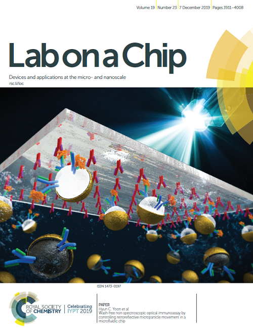우리 학교 연구팀이 심근경색 등의 질병을 스마트폰으로 간단히 진단할 수 있는 '광학 바이오센서'를 개발했다. 이에 따라 심근경색 의심 환자가 병원을 방문해 1시간 가량 소요되던 검사 소요시간을 15분까지 대폭 낮출 수 있게 됐다.윤현철 · 김재호 교수 연구팀(분자과학기술학과)은 '재귀반사형 광학 바이오센서' 개발 연구결과가 바이오센서 분야의 주요 학술지인 ‘랩온어칩(Lab on a chip)’의 표지논문으로 선정 게재됐다고 20일 밝혔다. 공동연구자로 김가람, 전형진 연구원이 센싱 시스템의 효용성을 증명하기 위해 ‘스마트폰 활용 면역진단용 랩온어칩 구현 연구’에 참여했다. 논문 제목은 이다. 이번 연구는 삼성전자미래기술육성센터의 ICT 창의과제 및 과학기술정보통신부 미래소재디스커버리 사업의 지원으로 진행됐다. 기존의 형광 기반의 광학 바이오센서는 특정 파장대의 광원이 필수적이고, 이를 관측하려면 광학 필터와 추가적인 광학 시스템이 필요해 기기의 구성이 복잡하고 가격이 높다는 단점이 있다. 이에 연구팀은 스마트폰에서 추가의 장치 없이 운용할 수 있는 광학 바이오센서를 구현하고자, 도로 표지판과 안전조끼 등에서 흔히 활용되는 ‘재귀반사(반사된 빛을 그 소스로 되돌려 보내는 현상)'에 주목했다. 연구팀은 “바이오센서의 신호검출원리로 재귀반사현상을 이용함으로써 특정 파장대의 광원이 아닌 일반적인 백색광에서도 민감한 신호를 얻을 수 있고 배경신호가 최소화됐다"며 "관측을 위한 복잡한 광학 시스템이 없이도 스마트폰에 내장된 플래시와 카메라만을 이용해 결과 검출이 가능하다"고 설명했다. 스마트폰에 결합된 바이오센서는 응급상황에서의 검사가 필요한 심근경색 등의 질병에 대응하는데 요긴하게 쓰일 것으로 기대된다. 연구팀은 심근경색 마커에 대한 면역진단용의 바이오센서의 시제품을 개발해, 상용화를 목표로 현재 창업프로세스를 진행 중이다.